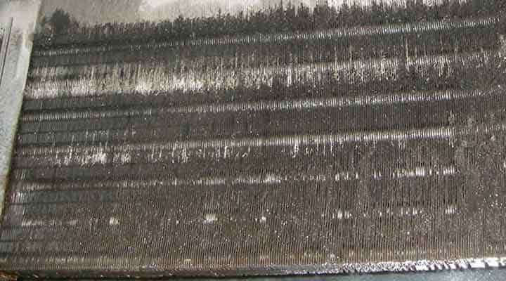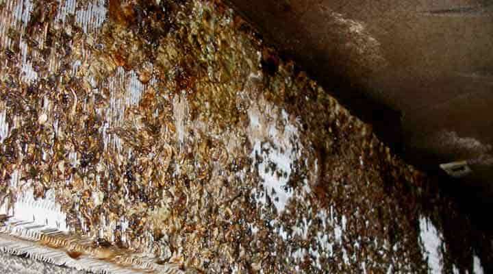 焼肉の煙、お客さまのタバコの煙を吸ったエアコン。熱交換器やフィルターなどのエアコン内部は油が幕を張った状態でした。また、ドレンパンは埃と油と水が混ざり合い、これも臭いの原因のひとつと思われます。
