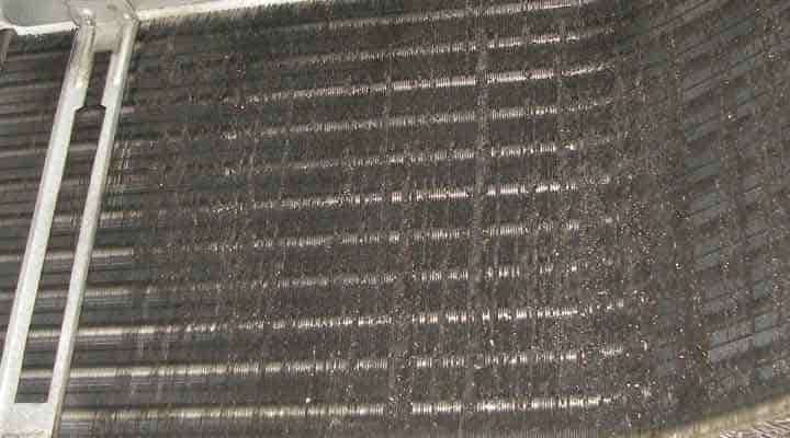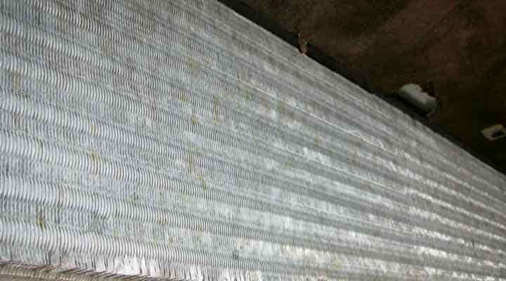 野菜についた土を落として出荷する工場のエアコン。野菜の汚れを水で洗うことも兼ねている場所のエアコンなので、土埃だけではなく湿気もエアコンが吸い込んでいました。