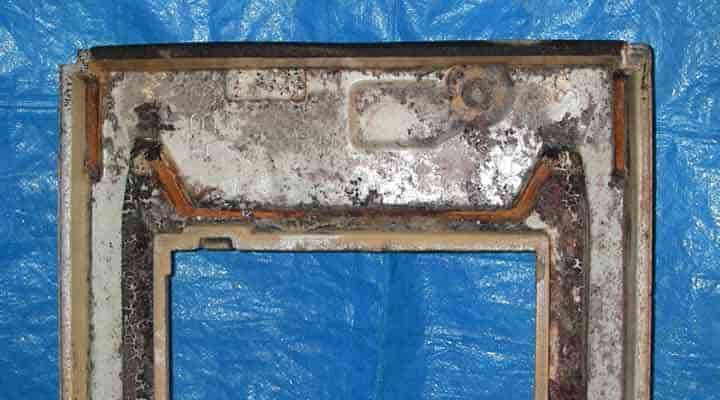 パン屋さんの厨房のエアコン。粉がエアコン全体を覆っていました。本来の空気の流れの道であるフィルター、熱交換器に粉が汚れとして体積していました。また、水を受けるためのドレンパンにも粉の汚れ。